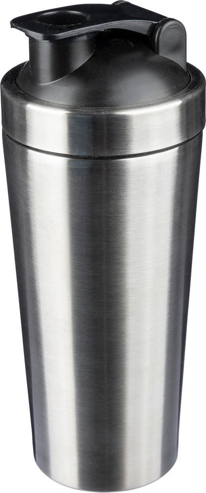 Gerecycled roestvrijstalen enkelwandige shaker (750 ml), gemaakt van roestvrij staal 304. Voorzien van een schroefdop van PP en een metalen shakerbal om te mixen. Lasergegraveerd gerecycled logo op de voorkant. Individueel verpakt in een kraftpapieren doos.