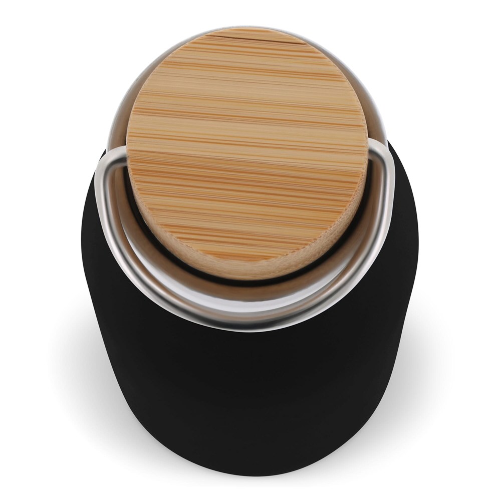 Dubbelwandige vacuüm geisoleerde fles met een houten deksel. Met een matte coating voor een moderne finish.