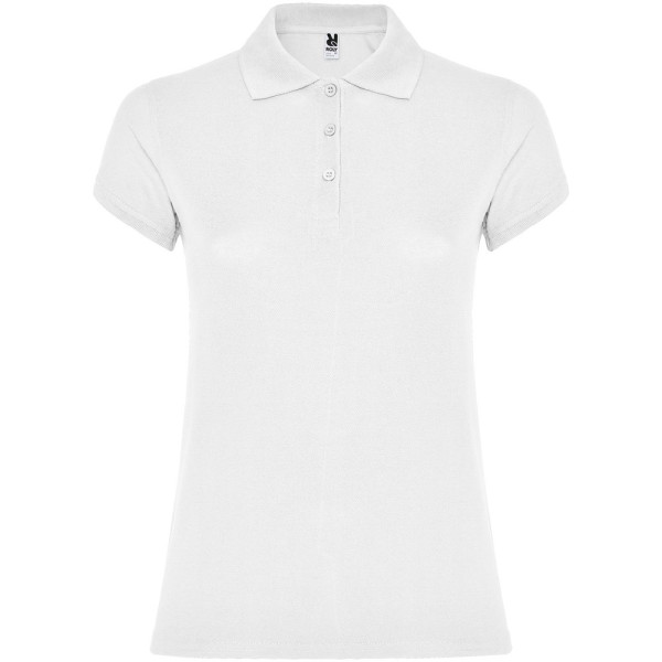 Poloshirt met korte mouwen voor dames. Versterkte bedekte naden in de binnenkant van de kraag. 1x1 geribde kraag en manchetten. Zijnaden en aansluitende snit. Smalle sluiting met drie knopen. Zijsplitten. Verwijderbaar etiket. Het model is 179 cm en draagt maat S.