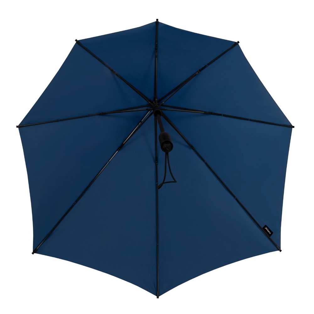 De aërodynamische stormparaplu met de brede achterkant voor maximale bescherming tegen regen..