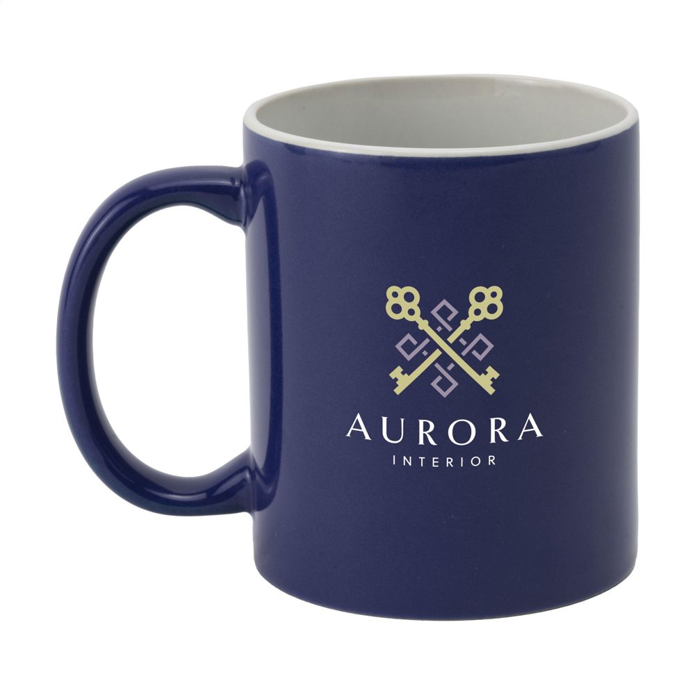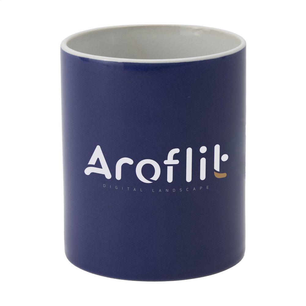 Mok van hoogwaardig keramiek. In geheel wit óf met gekleurde buitenzijde. Vaatwasserbestendig. De opdruk is vaatwasmachine getest en gecertificeerd: EN 12875-2. Inhoud 350 ml.