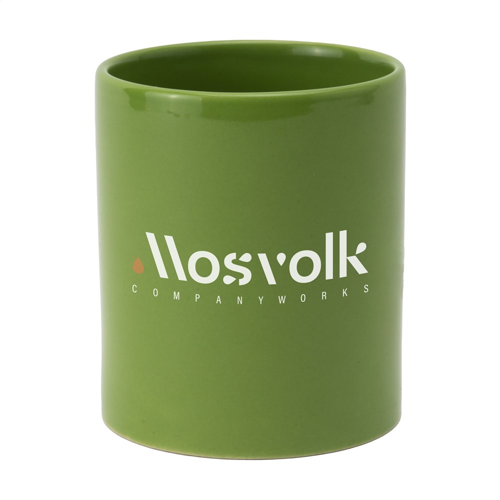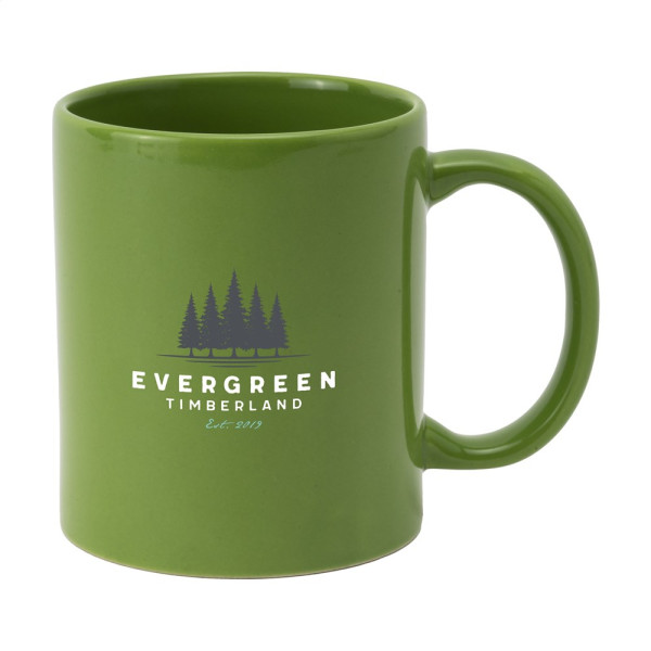 Mok van hoogwaardig keramiek. In geheel wit óf met gekleurde buitenzijde. Vaatwasserbestendig. De opdruk is vaatwasmachine getest en gecertificeerd: EN 12875-2. Inhoud 350 ml.