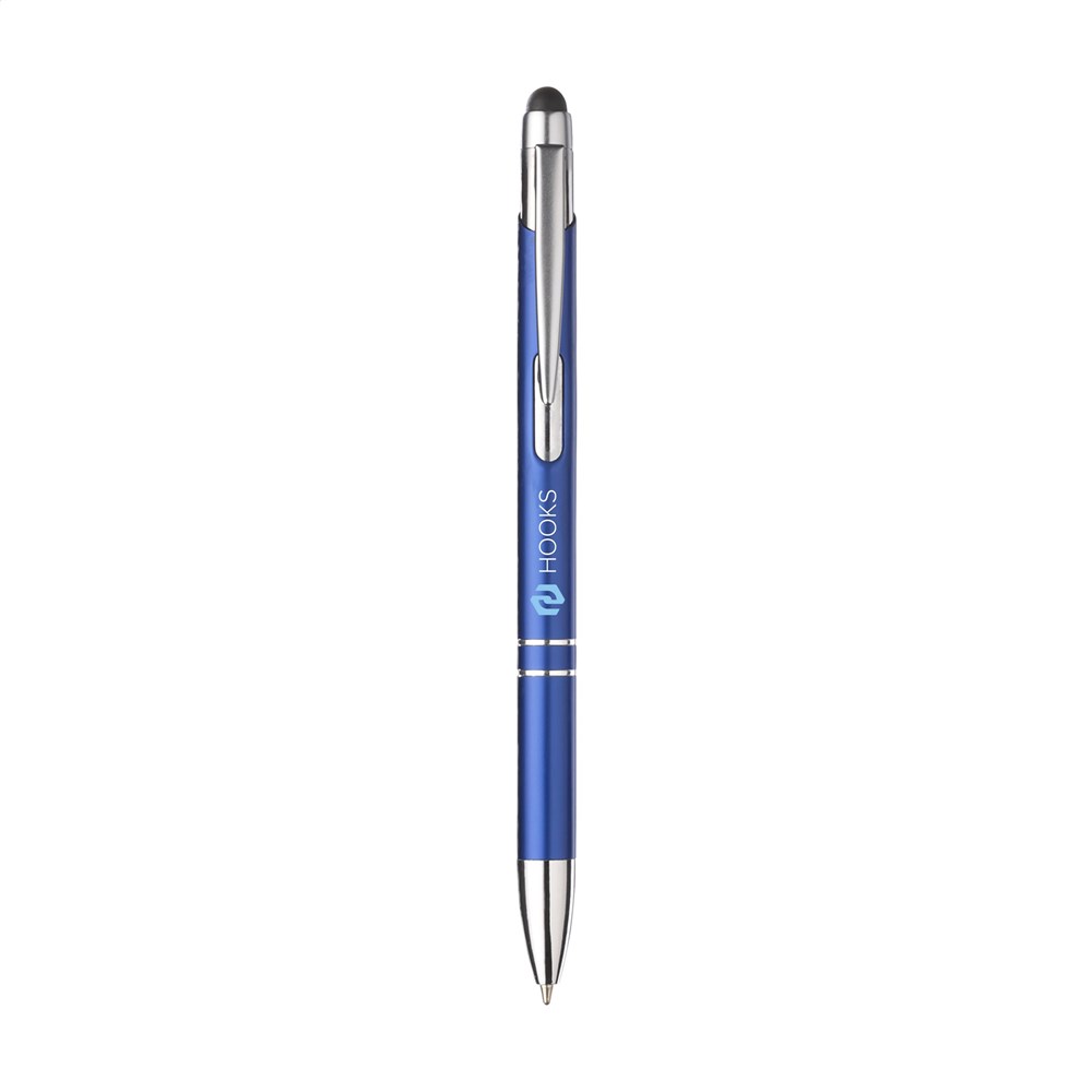 Blauwschrijvende, aluminium balpen. Met top/pointer voor het bedienen van touchscreens (zoals iPhone/iPad), matgekleurde, metalic look houder en metalen clip/drukknop.