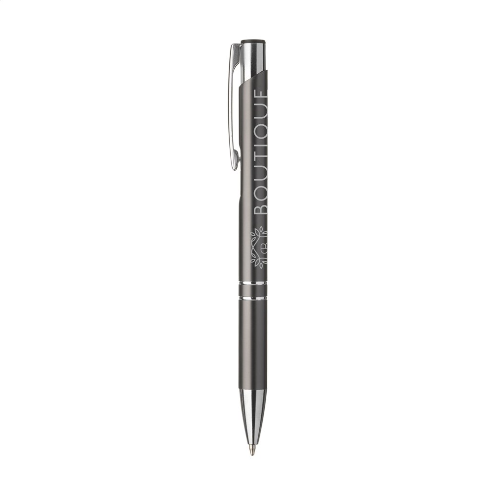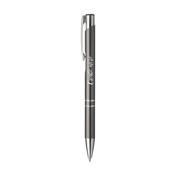 Blauwschrijvende óf zwartschrijvende, aluminium balpen met matgekleurde houder in metallic look en metalen clip.