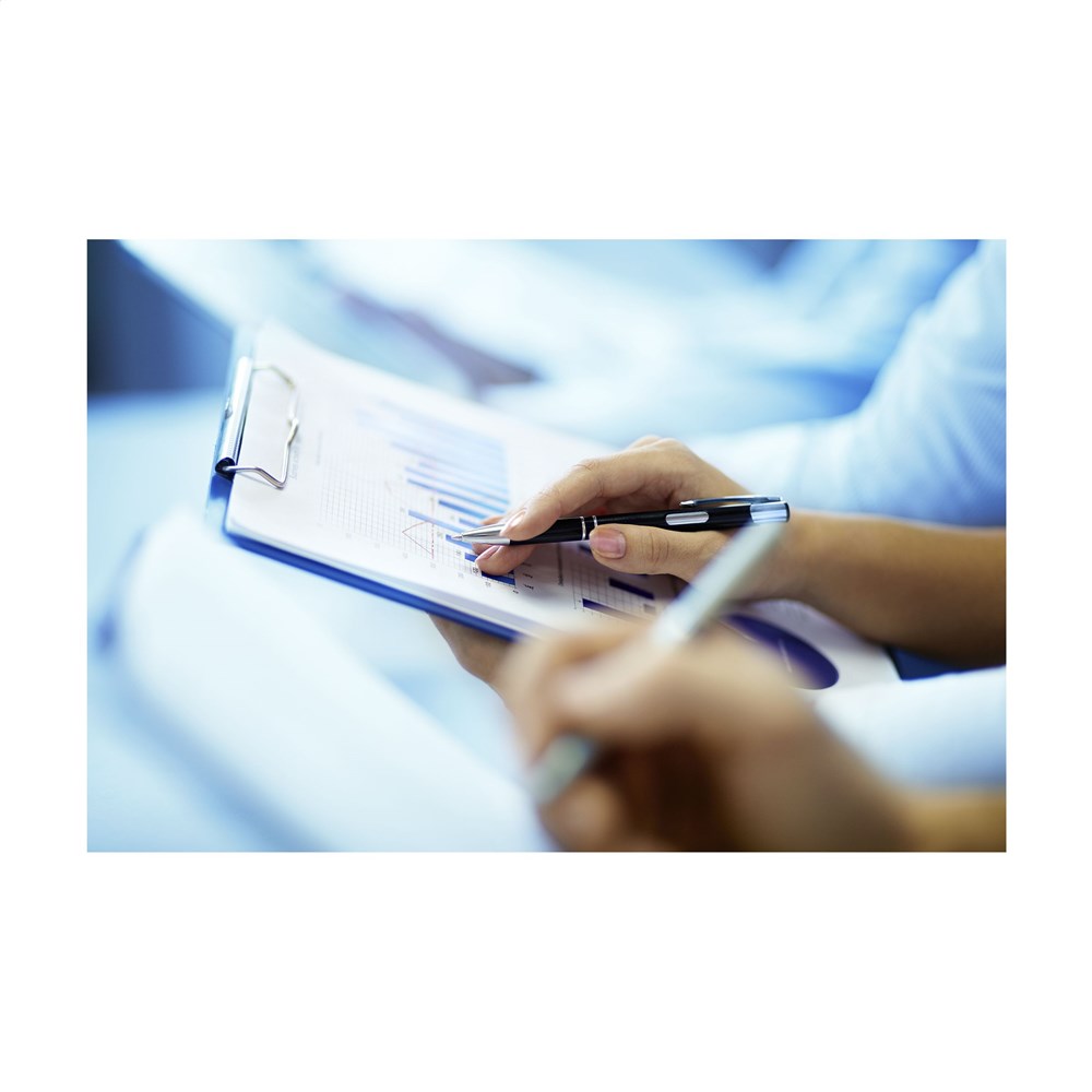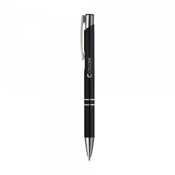 Blauwschrijvende óf zwartschrijvende, aluminium balpen met matgekleurde houder in metallic look en metalen clip.