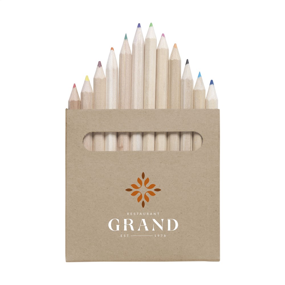 12 houten, ongelakte, geslepen kleurpotloden in een gerecycled kraft doosje.