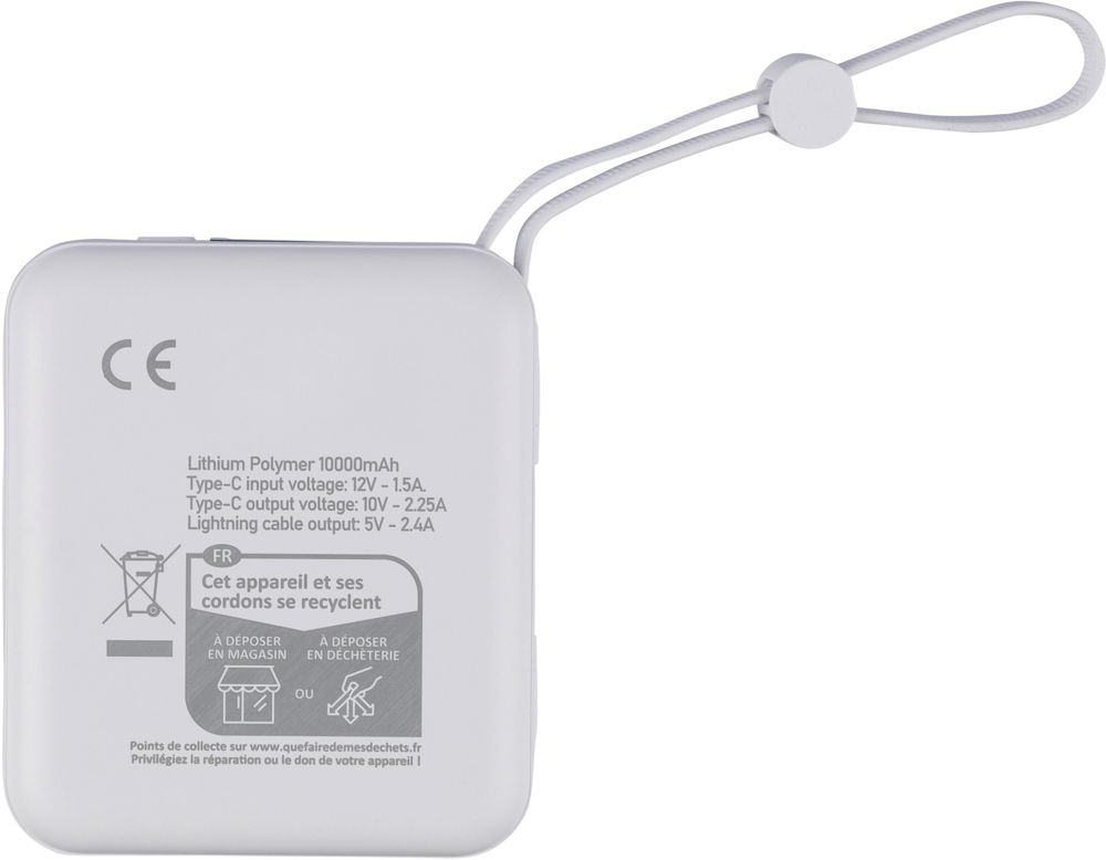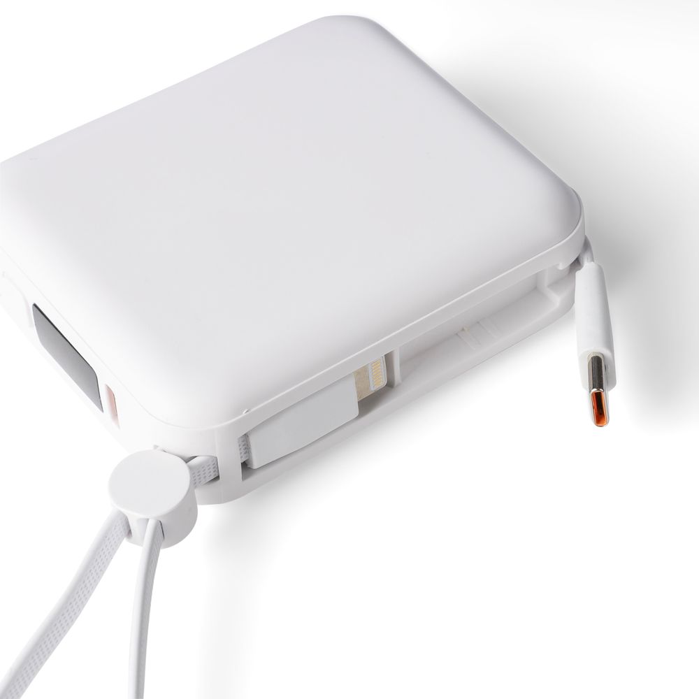 Gerecyclede ABS-powerbank met 10.000?mAh Li-ion batterij en 22,5W snellaaduitgang. Voorzien van een geïntegreerd TPE-draagkoord dat ook dienst doet als oplaadkabel met Lightning- en Type-C-connectoren. Uitgerust met een digitale LED-display bovenop voor het weergeven van de batterijcapaciteit. Inclusief Type-C in-/uitgang en Type-A ingang. Biedt bescherming tegen oververhitting, kortsluiting, overspanning en overstroom. Voorzien van label met gerecycleerd ABS-logo op de achterzijde. Individueel verpakt in een bruine kartonnen doos met zijdepapier aan de binnenzijde.