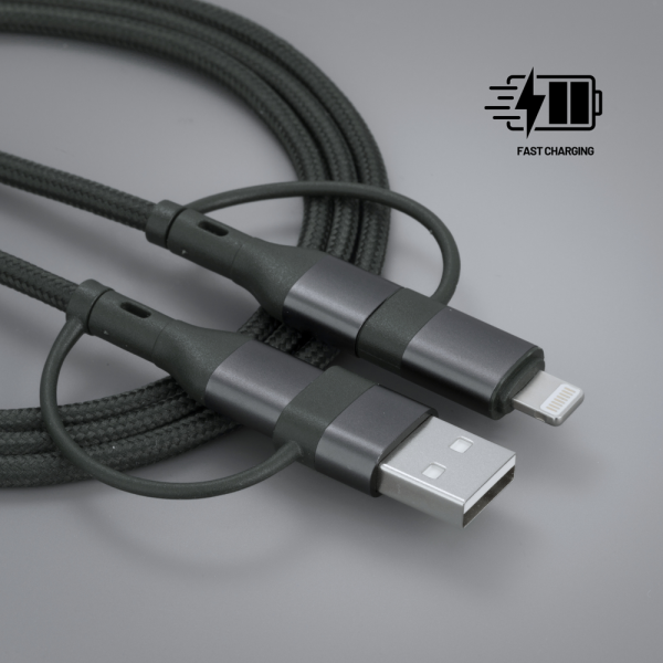 Deze kleurrijke 4-in-1 oplaadkabel met USB-A- en USB-C-ingangen en USB-C- en Lightning-uitgangen ondersteunt snel 3A laden en stabiele USB 2.0-dataoverdracht (tot 480 Mbps) in een duurzame gevlochten uitvoering van 1,2 m, verkrijgbaar in 10 kleuren. Versterkt met Kevlar, met geavanceerde afscherming tegen EMI/RFI en CE-EMC- & RoHS-conformiteit, biedt hij betrouwbare prestaties voor dagelijks gebruik thuis, op kantoor of onderweg.