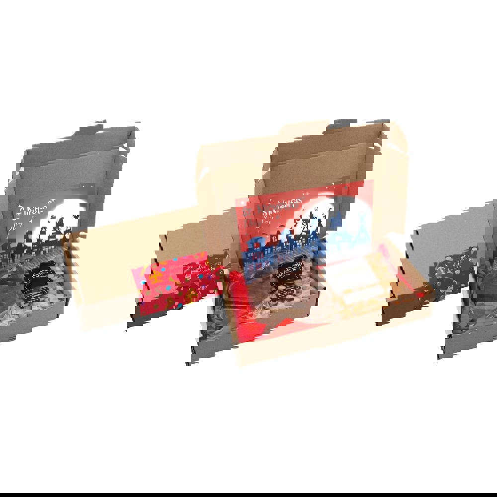 Bruin verzenddoosje A6 gevuld met een zakje Kruidnootjes en een chocolade Schoenletter. Voorzien van een dubbelzijdig bedrukte A6 kaart en gesloten d.m.v. een standaard Sinterklaassticker