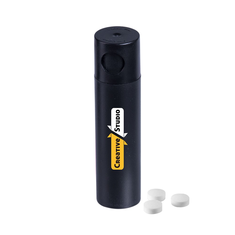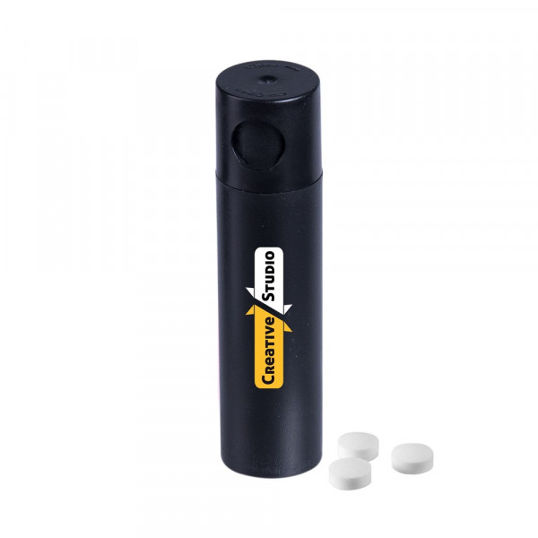Zwart mintkokertje voorzien van een full colour bedrukking aan de voorzijde, gevuld met ca. 7 gram mini pepermuntjes
