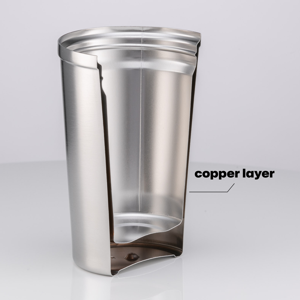 Materiaal: POSCO 18/8 RVS, koperlaag, poederlak, silicone