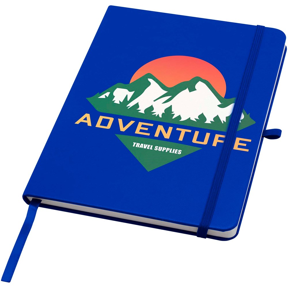Het Teak A5 notitieboek met harde kaft en afgeronde hoeken is niet alleen onmisbaar op kantoor, maar ook een geweldige kans om je merk te promoten. Het notitieboek heeft 96 gelinieerde vellen van 70 g/m2 papier en een zacht aanvoelende cover. Wordt geleverd met een pennenlus, elastische sluiting en lintmarkering.