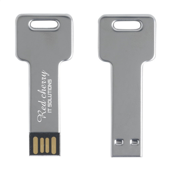 Stalen USB stick in de vorm van een sleutel, voor het veilig en handzaam bewaren en vervoeren van bestanden. Direct klaar voor gebruik door 'Plug&Play' systeem. Bruikbaar onder Windows, Mac en Linux. Standaard per stuk in kartonnen doosje. De prijs is inclusief opdruk in 1 kleur op 1 zijde.