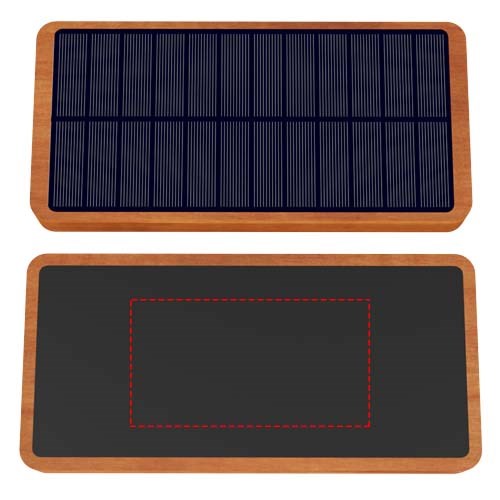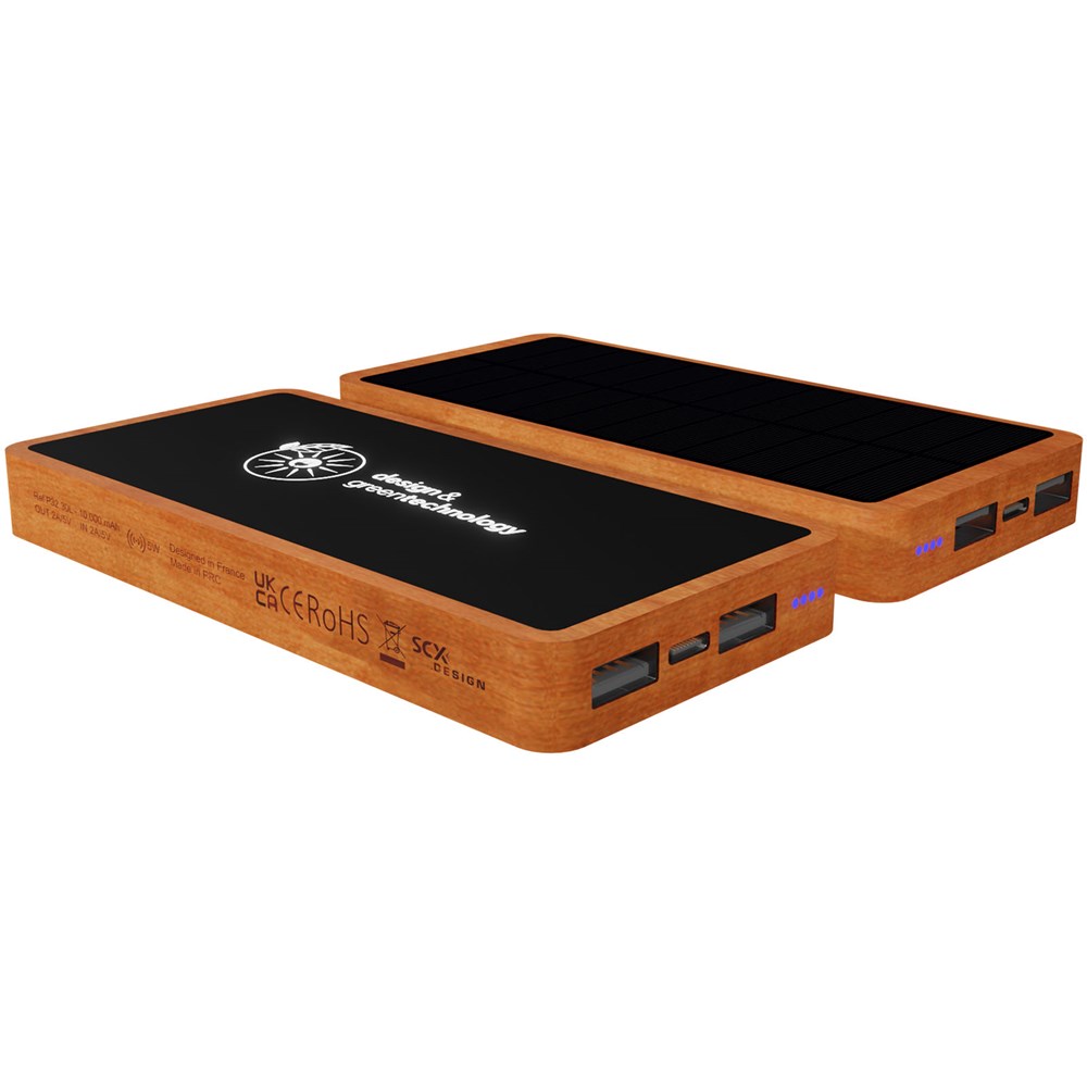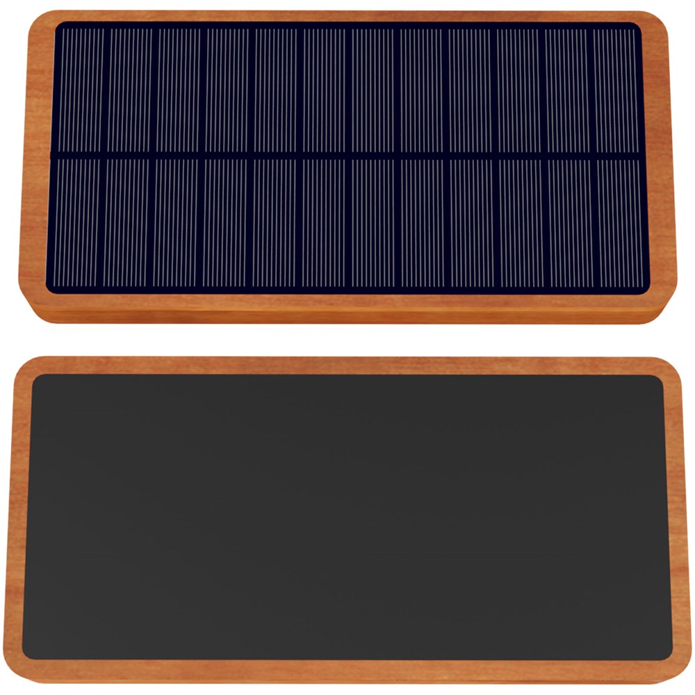 Powerbank op zonne-energie (14,4 x 6,9 x 1,95 cm) gemaakt van hout en zacht aanvoelend gerecycled plastic. Hij heeft een capaciteit van 10.000 mAh en kan worden voorzien van een oplichtend logo. De powerbank kan worden opgeladen met het zonnepaneel van monokristallijn of met de meegeleverde 5-in-1 oplaadkabel van rPET. Deze powerbank heeft een USB-C- en USB-A-ingang/uitgang en een 5 W draadloze uitgang. Je apparaten kunnen worden opgeladen met de meegeleverde kabel of draadloos (5 W). Het logo licht gedurende 30 seconden op wanneer de powerbank wordt gebruikt en blijft branden tijdens het opladen. Verpakt in een geschenkverpakking van gerecycled papier (20 x 8,8 x 2,8 cm). Inclusief 3 jaar garantie.