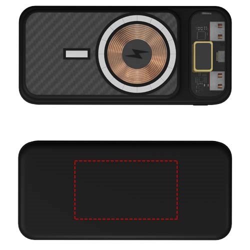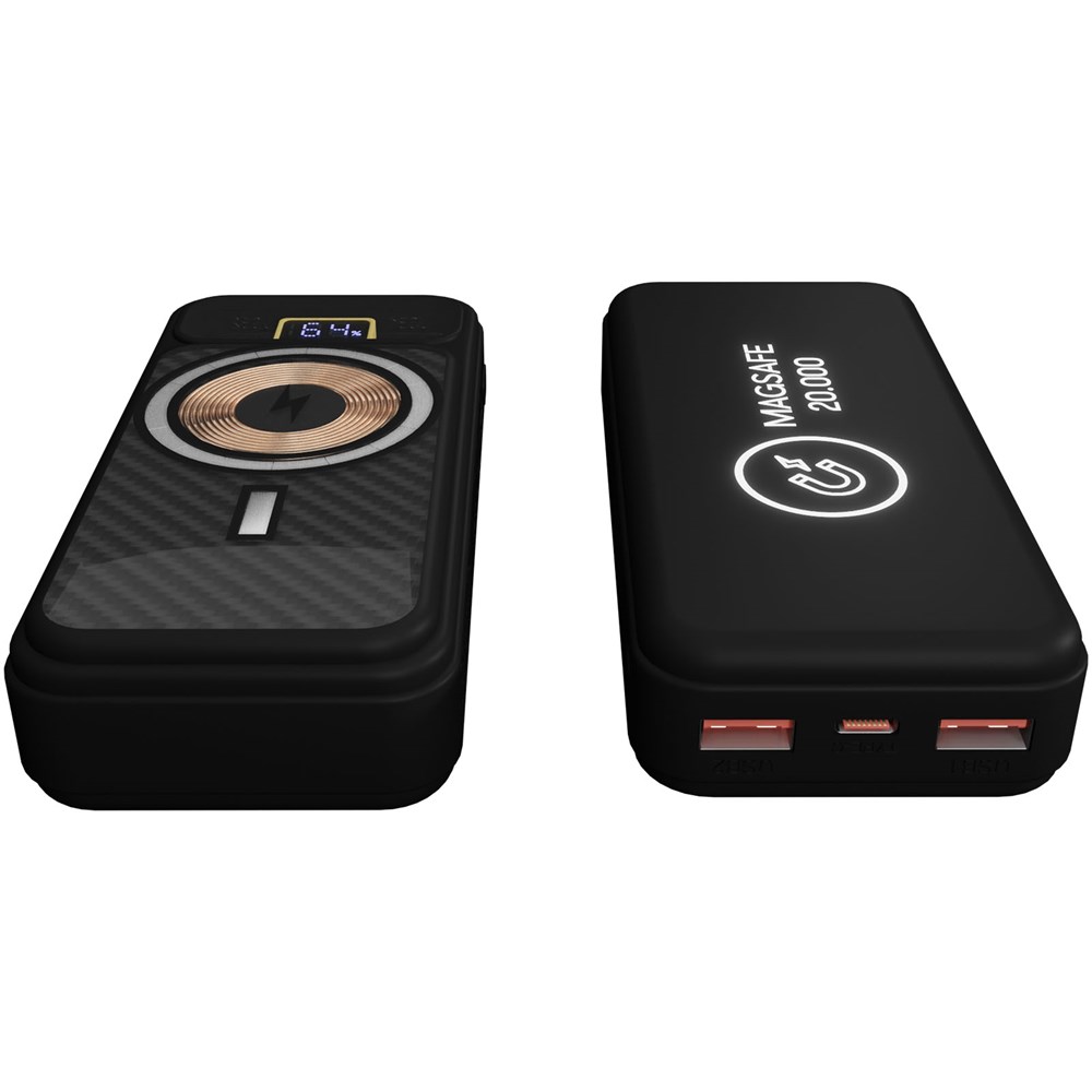 Powerbank met een capaciteit van 20.000 mAh, oplichtend logo en MagSafe-technologie, waardoor deze magnetisch aan de achterkant van een telefoon kan worden bevestigd. De technologie van deze powerbank wordt onthuld dankzij de transparante behuizing die de printplaat binnenin laat zien. Met een digitaal batterijdisplay en USB type-C-uitgang/ingang. De behuizing is gemaakt van minimaal 50% gerecycled plastic. Als je telefoon geen MagSafe-technologie heeft, kun je de meegeleverde magnetische sticker op de achterkant van de telefoon plaatsen, zodat deze compatibel is met de meegeleverde magnetische houder. Afmetingen van de powerbank: 14,5 x 6,7 x 2,4 cm. Verpakt in een geschenkverpakking van gerecycled papier (18,8 x 8,48 x 3,8 cm) met magnetische sluiting. Inclusief 3 jaar garantie.