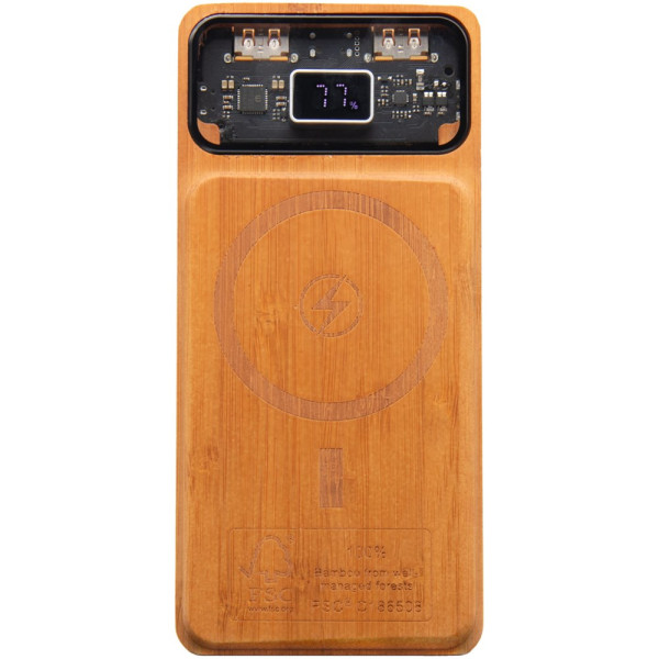 10.000 mAh powerbank gemaakt van 65% hout, met oplichtend logo en MagSafe-technologie, waardoor de powerbank magnetisch aan de achterkant van je iPhone (12 en later) kan worden bevestigd. De powerbank heeft een digitaal display en USB Type-C uitgang/ingang en wordt geleverd met een 3-in-1 rPET-kabel (5 V/2 A) met 3 connectoren (Type-C, Micro USB, iPhone). Als je telefoon de MagSafe-technologie niet ondersteunt, maar wel draadloos opladen, kun je de meegeleverde metalen ringsticker op de achterkant van de telefoon plakken om deze compatibel te maken met de magnetische houder. Verpakt in een gerecyclede kartonnen geschenkverpakking (18,6 x 10 x 2,6 cm).