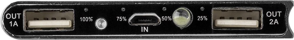 ABS en aluminium zonne-energie powerbank, 8.000 mAh. Input DC5V/1A. Output data: DC5V / 1A and DC5V / 2.1A. Met USB aansluiting en laadkabel (USB – micro USB).